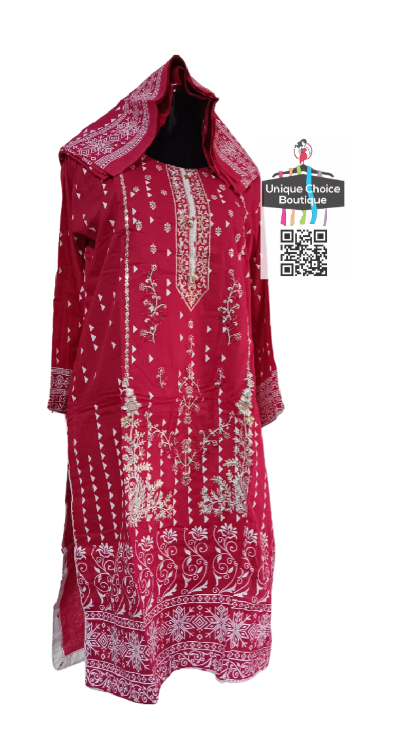 Maroon Red 3pc Stitched Salwar Suit Roman Silk Partywear with Handbag– Kurti, Pant, Dupatta Set