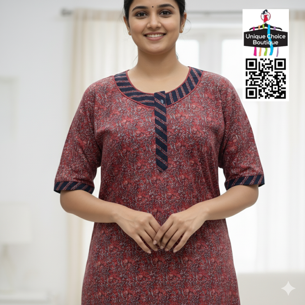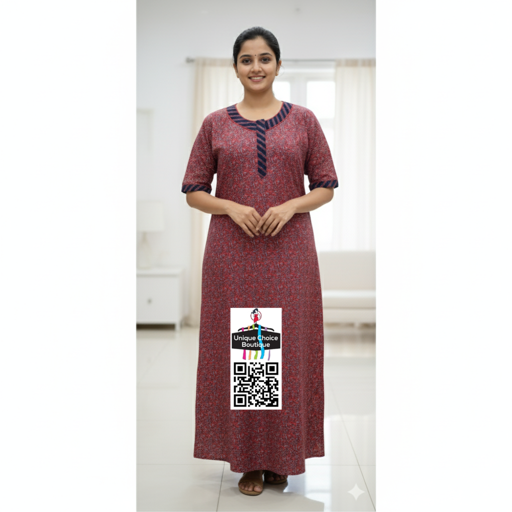 UNIQUE CHOICE brings to you Comfortable nighties for a perfect and sound sleep. Ideal for bedtime, we have designed comfort nightwear that suits your skin, and offers you 100% satisfaction. The Cotton fabric is soft, and the fit is tailored according to your body type.