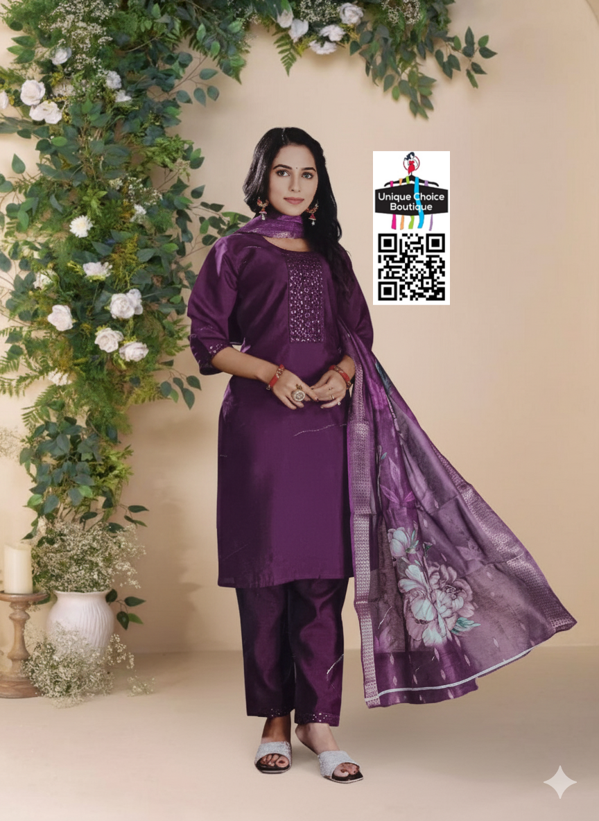 Purple Roman Silk Kurti Pant Dupatta Set, 3pc Salwar Suit Set