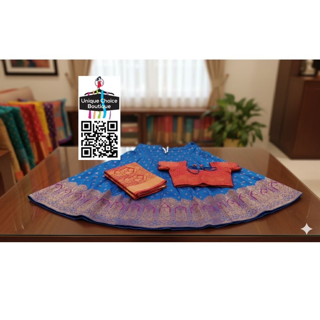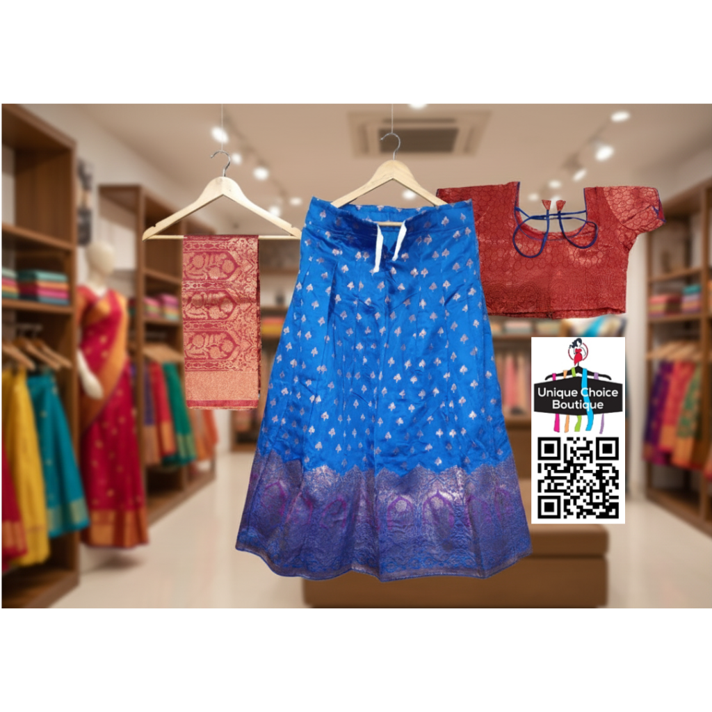 Luxury Blue Silk Half Saree Lehenga Set with Red Brocade Blouse | Kanjivaram Style for UAE Festive & Wedding Wear